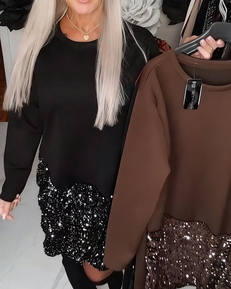 Kleid Runder Ausschnitt Langarmig Mit Pailletten Patchwork