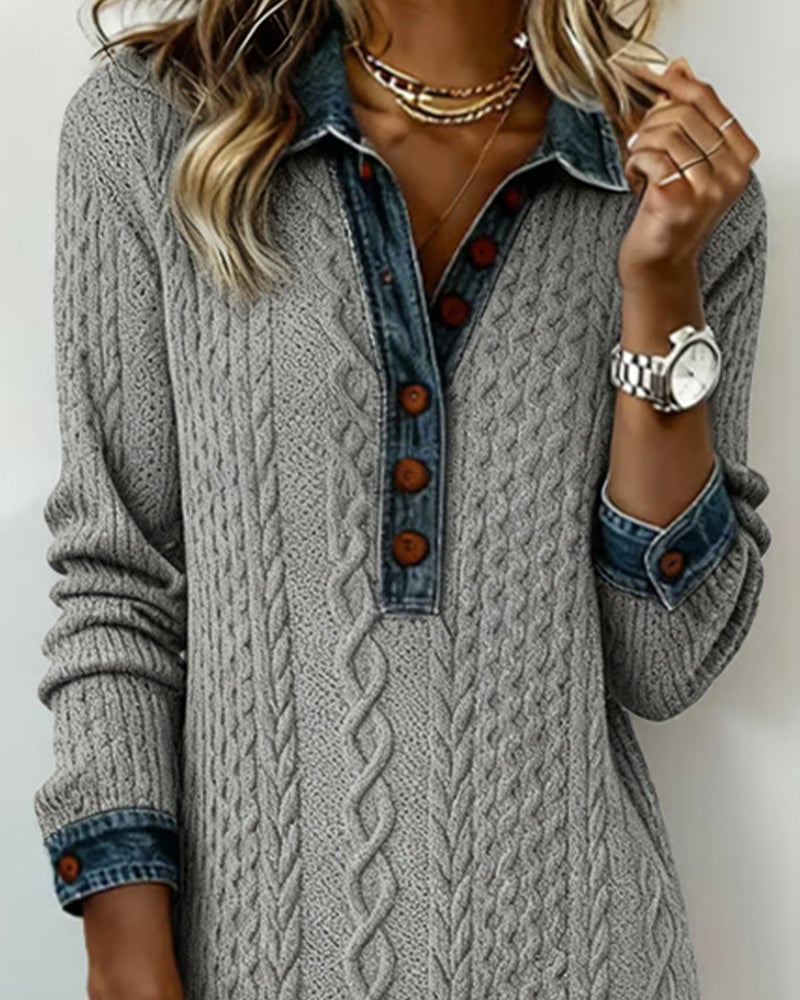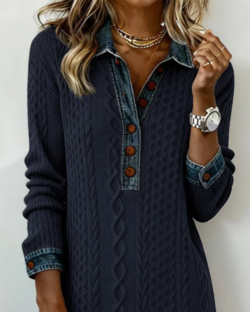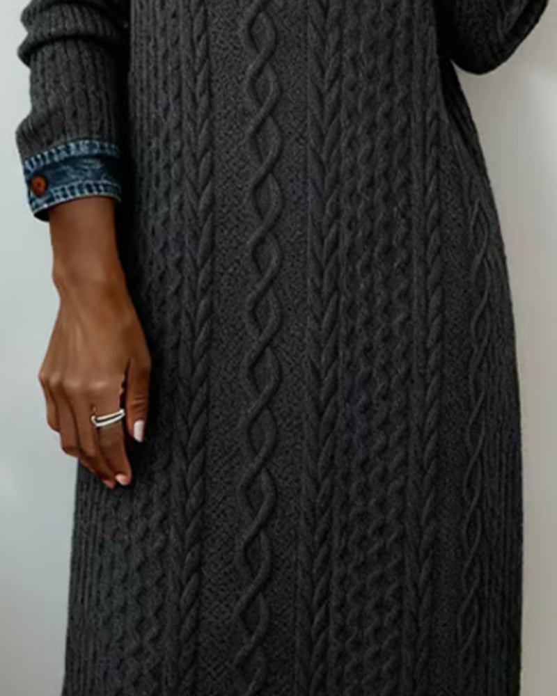 Kleid mit Kragen aus Denim, Zopfmuster-Strick und Patchwork